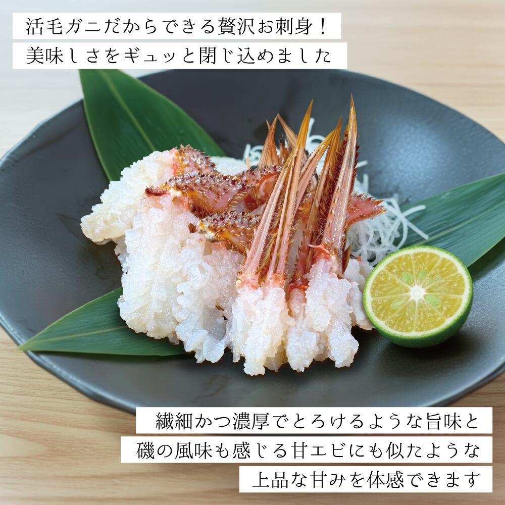 北海道産 活毛蟹は 甘く濃厚な身 芳醇なカニ味噌 プリプリの食感 そして「活」で届く鮮度の高さという魅力が詰まった商品です。